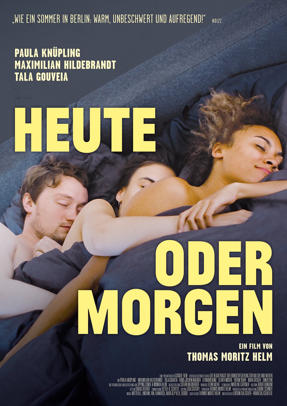 In seinem sinnlichen Debütfilm erzählt Thomas Moritz Helm ein modernes Berliner Sommermärchen fernab von konservativen Moralvorstellungen. Im Zentrum stehen drei junge Menschen, die nach einer neuen Definition von Liebe und Beziehung suchen, die sich für sie richtig anfühlt. In den Hauptrollen glänzen die Nachwuchsdarsteller*innen Paula Knüpling, Maximilian Hildebrandt und Tala Gouveia.